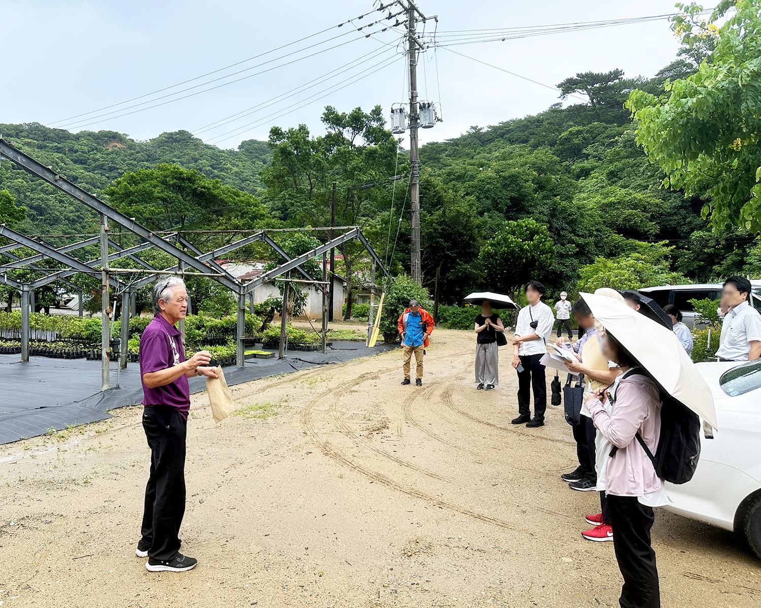 国頭村森林組合では、長い年月をかけて種から苗木を育てて、伐採した箇所に植樹しています。2024年11月、記録的な大雨によって比地川が氾濫し、苗木を育てていた畑も被害にあいました。今ようやく畑を再開し始めたので、苗畑の復興支援として「被災地見学ツアー」の視察を始めています。苗畑や植樹した場所を見て回り、湧き水を汲んで水の価値を知ってもらい、最後は製材工場を見学する行程です。