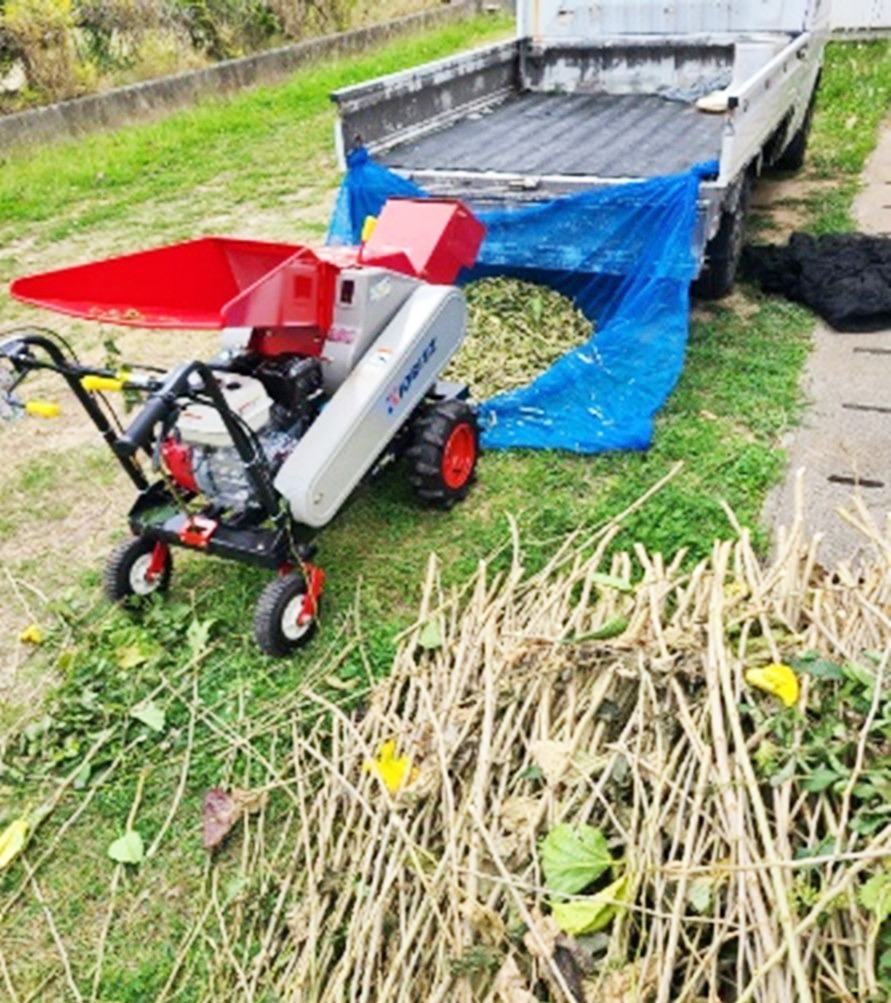 桑葉は手摘みしているのですが、枝の部分はこれまで廃棄・焼却していました。これも有効活用しようと、桑枝をチョッパー機で細かく裁断し、桑圃場の土壌改良に再利用しています。水はけも良くなり、肥料の量を減らすことにも成功しました。