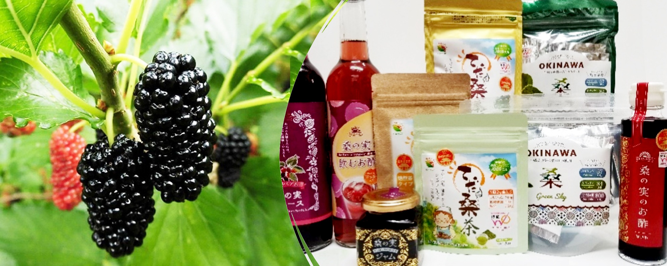 私たちが育てている桑の実「宮古島四倍体」は、自生してる桑の実の約7倍の大きさの実がなることが特徴で、収穫量や作業効率を上げることが可能です。収穫後の実を急速冷凍して保管し、絞ってピューレやジュースにした後、ジャムやフルーツ酢などに加工しています。「桑の実スティックジャム」は、浦添市内や沖縄県内の小中学校の給食にも採用されています。