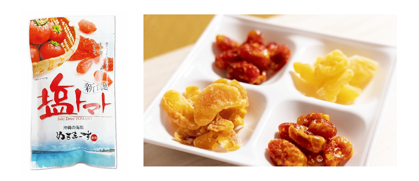 沖縄の素材をもっと活用した商品開発をすることで、健康食品の市場のみならず、多くの消費者へ沖縄素材を知ってもらうきっかけになればとの思いから、沖縄海塩「ぬちまーす」を使った新食感のドライトマト「塩トマト」や「梅塩トマト」、県産シークヮーサー果汁パウダーとドライみかんを合わせた「シークヮーサーみかん」や県産パイン果汁パウダーを使用した「パイナップルぱいん」など、菓子製造を基本とした新しい分野へもチャレンジしています。