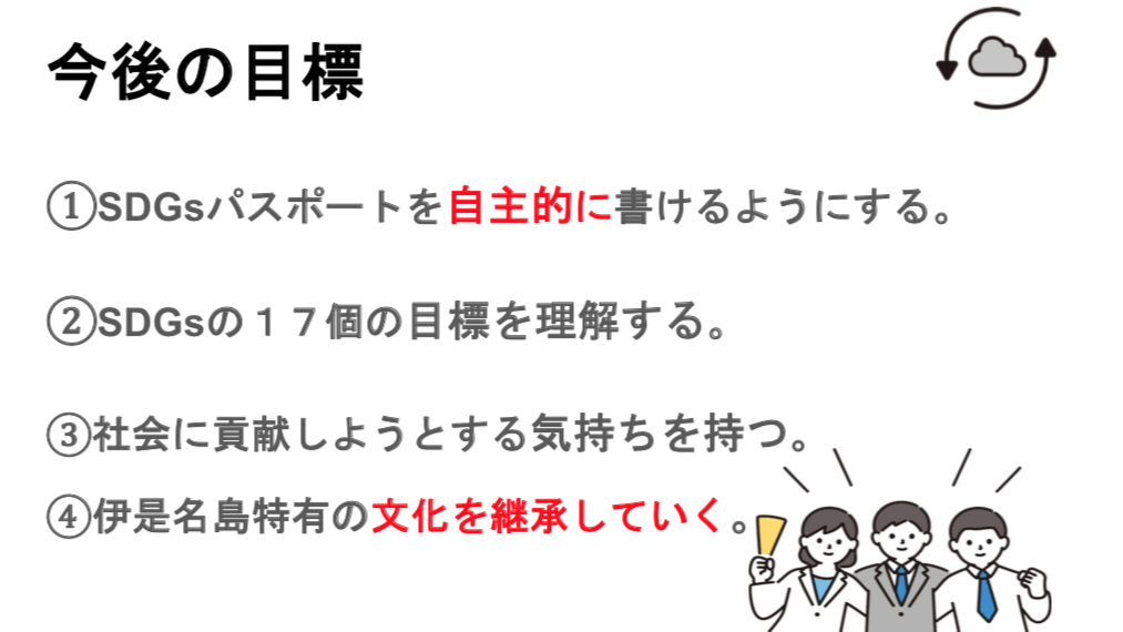 SDGsの視点で、地域の自然や暮らしについて調べ合う活動等を通して、地域の素晴らしさと変わりゆく自然環境に気づき、故郷の良さを守り、環境にやさしい社会を築くために自ら参画できることを考え実践できる児童の育成。