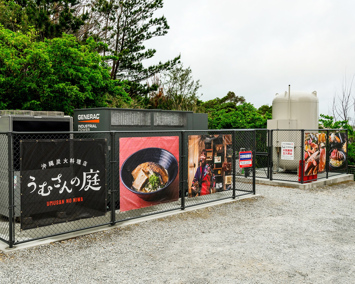 そこで、ホテルのお客さまだけでなく、近隣住民やスタッフの安全確保のために、経済産業省・資源エネルギー庁所轄の補助金交付を得て、「災害用ガスバルク並びにガス発電機」を、2 つのホテルに隣接している「沖縄炭火料理店 うむさんの庭」に設置しました。これは、沖縄県内飲食店としては初の試みで、沖縄県内では最大規模の設備です。
